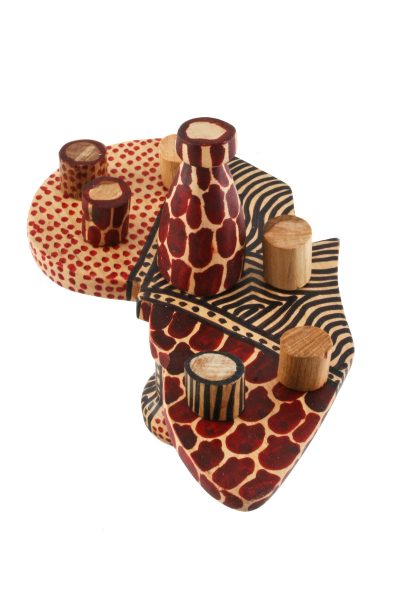 This joyous and unique artwork comes to us from a talented group of Kenyan artisans who are skilled at carving jacaranda, a prolific tree in East Africa. Each animal is hand-carved and hand-painted, as well as the table and beverage accessories.