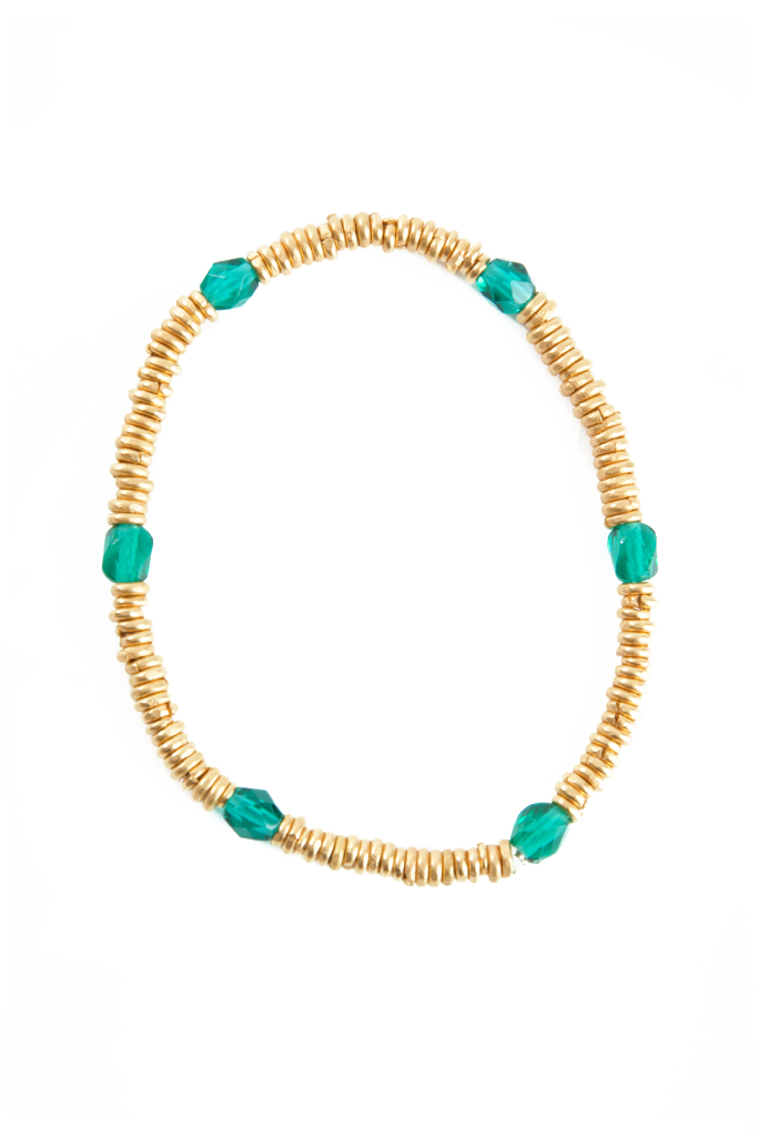 These delicate, colorful bracelets bring style and texture to your wrist. The handcrafted bracelet features heishi in 24 karat gold plate, with green glass accent beads, all on a clear stretchy cord.