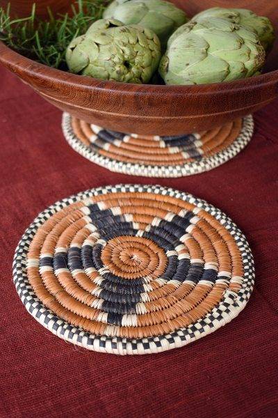 Talented baskets weavers in Zambia craft these stylish trivets from natural fibers. Sold in assorted designs in neutral, earthy tones, each trivet can be used to protect surfaces from hot pots and serving dishes.
