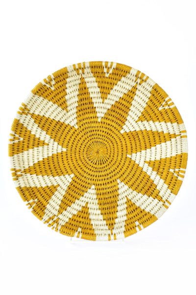 Talented weavers in Zimbabwe craft these beautiful baskets by hand from rough sisal fiber. Sold in assorted patterns with a mustard yellow theme, each basket is a work of art. Multiple baskets display beautifully together on a wall.