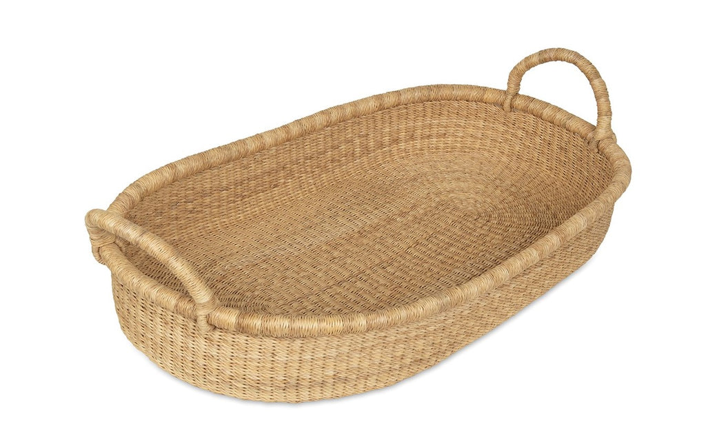 Meet our award winning Moses baskets: winners of the bronze award for best baby crib, pod or Moses design in the Junior Design Awards 2021. Keep a close eye on baby as they nap and do those nappy changes in comfort and style with our exquisite woven baby baskets. These hand woven Moses baskets and baby changing baskets are ethically hand made in Northern Ghana: nine different moses basket designs finished in sustainably-sourced goat’s leather, and a choice of two natural elephant grass changing baskets, with or without leather-bound handles. We think you’ll be hard pressed to find an ethical baby gift that brings more joy and delight than one of these babies.