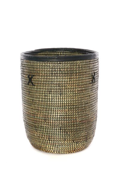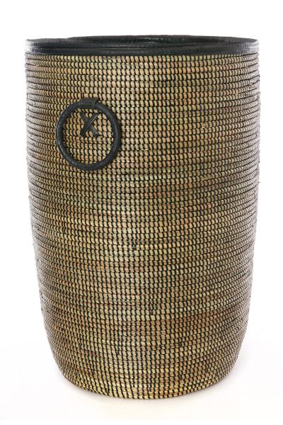 Talented Wolof women in rural Senegal utilize abundant cattail stalks and strips of salvaged plastic into beautiful storage bin baskets for the home. The largest bin includes leather trim, and leather ring handles. The smallest basket has leather trim only.