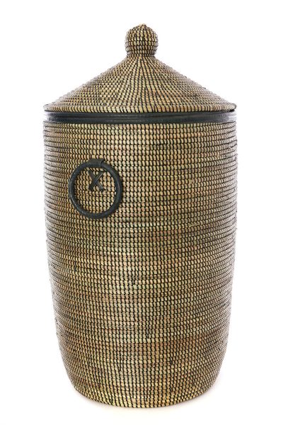 Talented Wolof women in rural Senegal utilize abundant cattail stalks and strips of salvaged plastic into beautiful storage hamper baskets for the home. The largest hamper includes leather trim, and leather ring handles. The smallest basket has leather trim only.