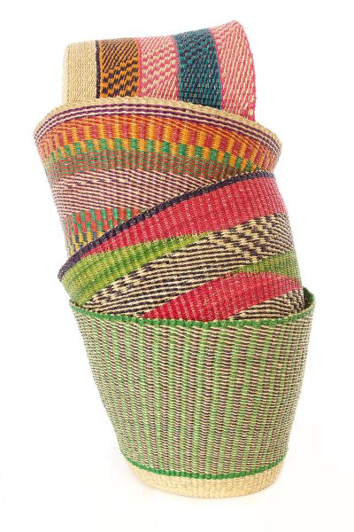 Basket weavers in Bolgatanga, Ghana, are incredibly talented at creating gorgeous multicolor baskets with intricate designs. This useful open-top bin is handmade from stiff elephant grass, and can be easily reshaped by just spraying with a little water.