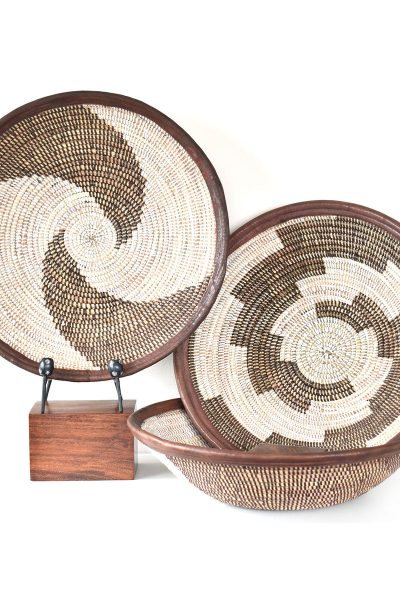 Talented Wolof basket weavers in rural Senegal transform abundant cattail stalks and salvaged plastic strands to create useful tabletop baskets that double as art. Each basket features a unique woven design, and a rim bound in soft brown leather.