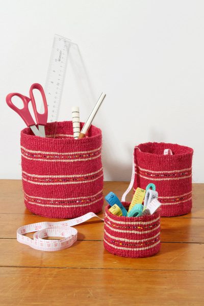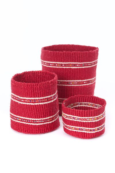 These finely woven storage baskets are handcrafted in Kenya from the fiber of the agave sisalana plant, dyed to a vibrant cherry red. More refined than our larger sisal baskets, these three little nesting containers are dressed up with colorful beads and can be used to store small items throughout the home.