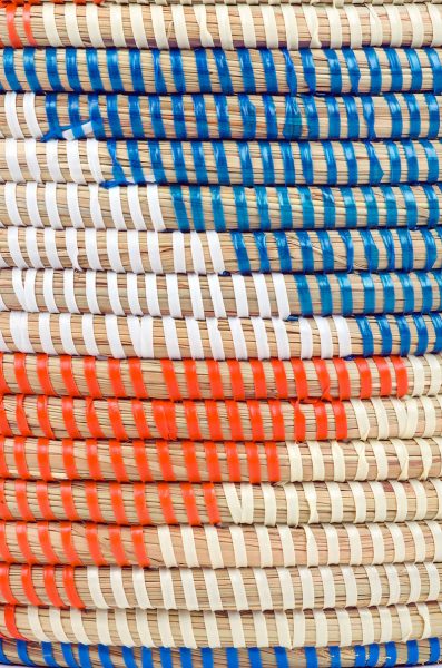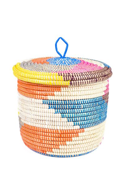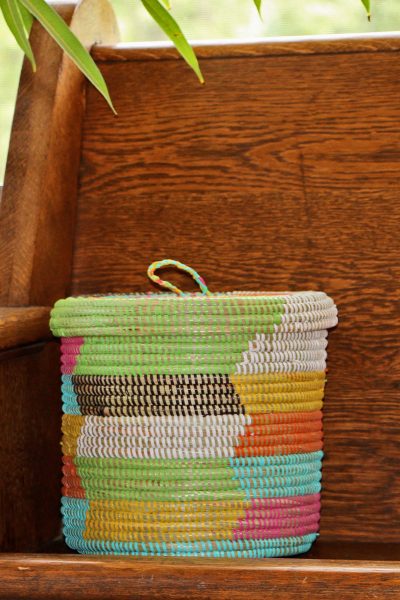 Wolof women in Senegal weave this colorful storage container by binding cattail stalks with colorful strips of plastic recycled from prayer mats or purchased as salvaged end cuts at a mat factory in Dakar.