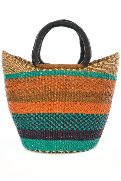 Artisans in the Bolgatanga region of Ghana weave beautiful shopper baskets from thick, tough elephant grass. Each basket features a unique color and design, chosen by the weaver. Leather wrapped handles make the shopper more comfortable to carry.