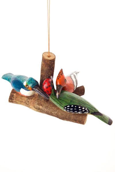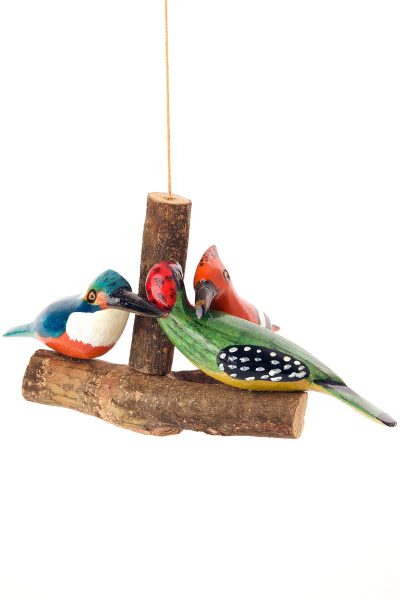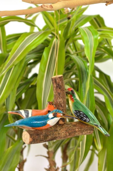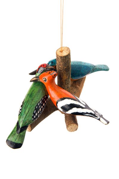 Kamau is a talented carver and painter who specializes in bird art. This sweet ornament features?three hand painted birds perched together on a piece of jacaranda wood.