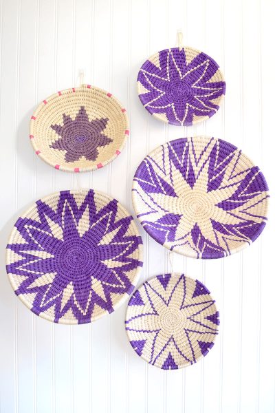 Talented weavers in Zimbabwe craft these beautiful baskets by hand from rough sisal fiber. Sold as a hand-picked set of five baskets in purple and natural patterns, these baskets are meant to be displayed together, but you can always opt to sell them singly, if you wish.
