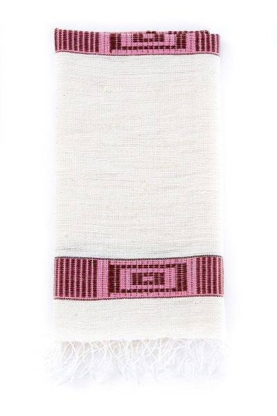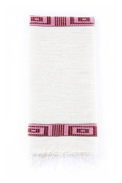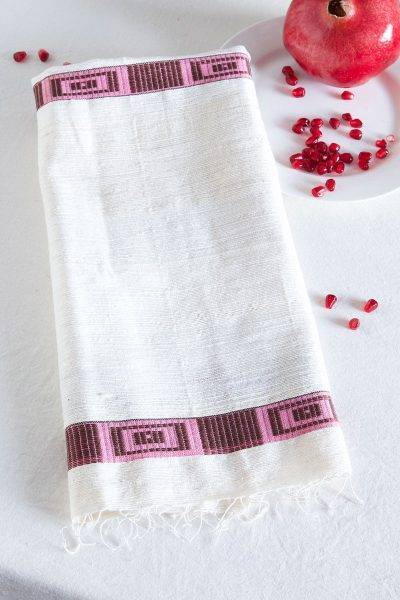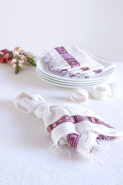 Intricate pink banding and delicate fringe adorn these beautifully natural handmade textiles for the home.