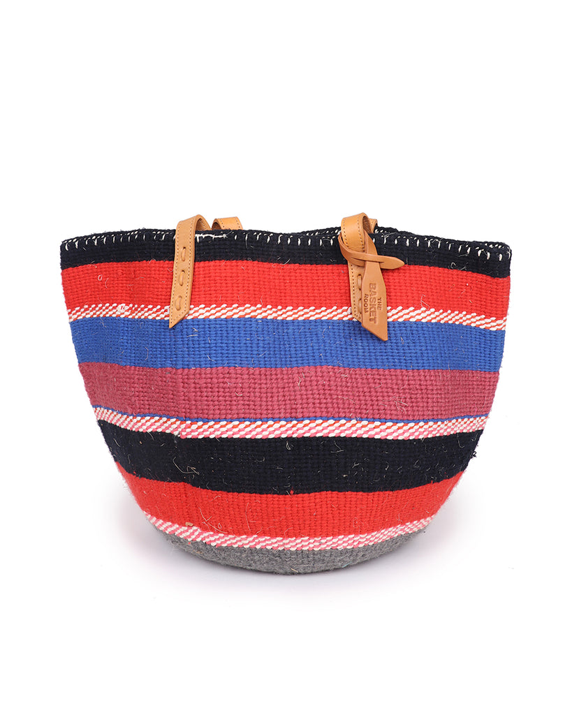 These basket bags are made from wool from second hand jumpers, woven around local sisal grass. The weavers regularly visit the ‘gikombas’ (clothes markets) to select and purchase colourful woollen jumpers, which are washed and unravelled at home into separate balls of coloured wool – and then woven. The bags are finished in a local leather works, being fitted supple cow hide straps for carrying.