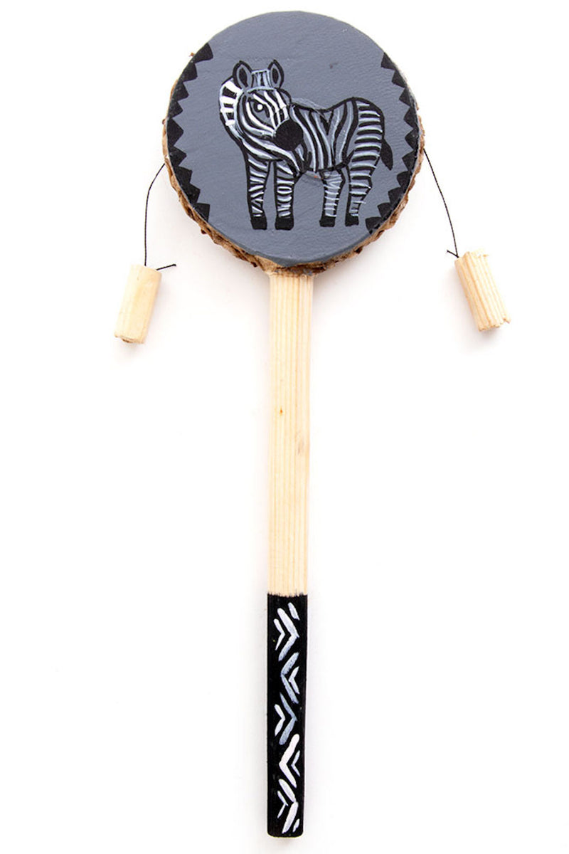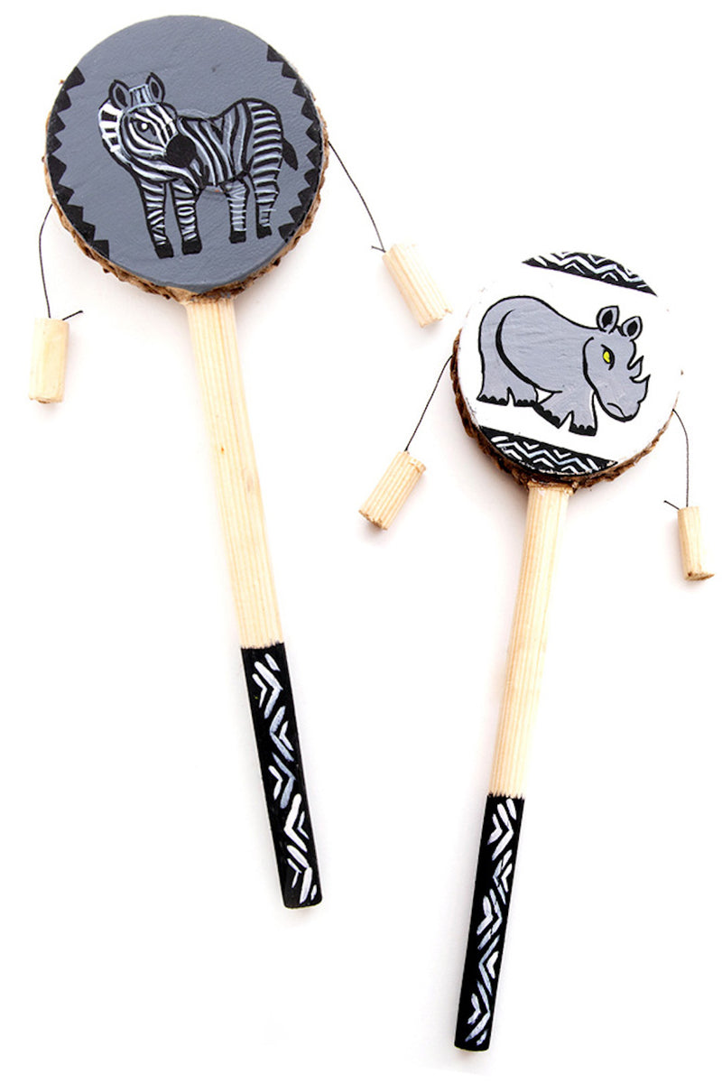 Kenyan artisans style these fun spin drums from goatskin, plastic and wood. Each drum features a hand painted rhino design on one side, and a zebra on the other.
