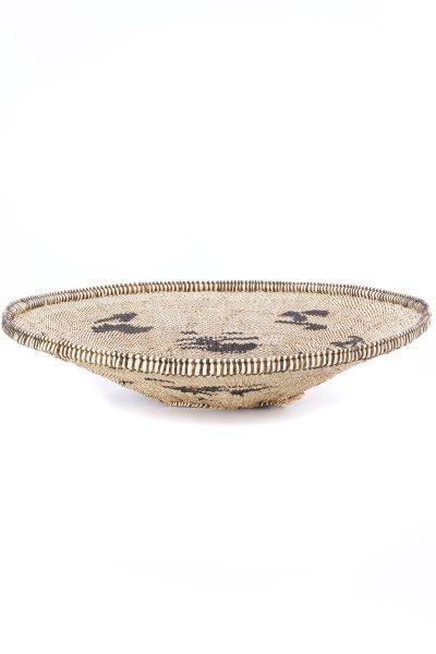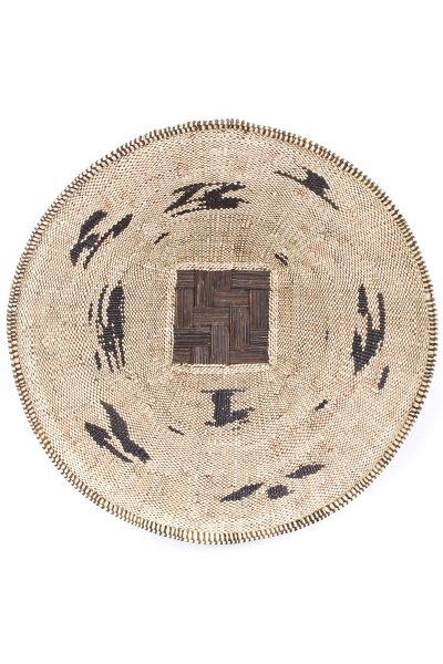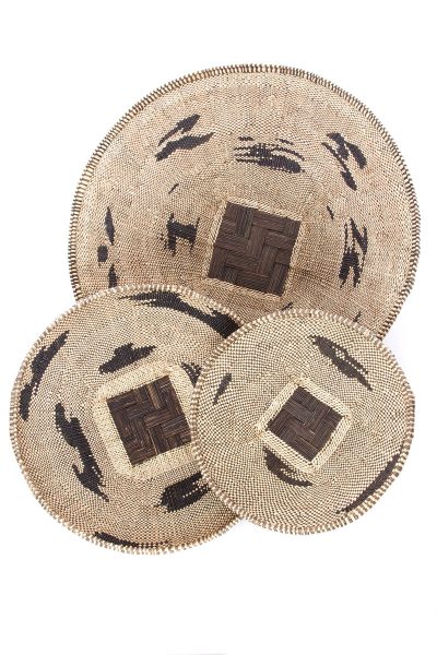 In the Pemba and Monze districts of Zambia’s Southern Plateau, skilled Batonga women craft iconic baskets from locally harvested palm leaves and wild twigs. The weavers artfully elevate single-use plastic bags that would otherwise be discarded to add assorted graphic motifs to their baskets.