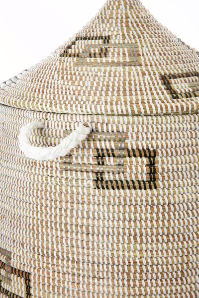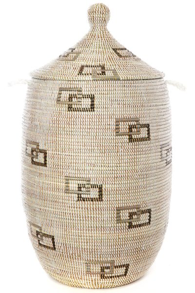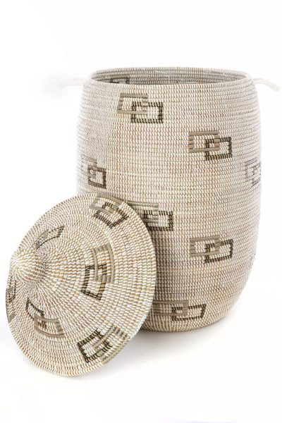 African laundry hampers bring beautiful modern artisan craftsmanship to homes around the world. Handwoven by an association of more than 100 rural Wolof women in the West African nation of Senegal, these useful storage baskets are woven in the coil style by binding dried cattail stalks with plastic strips salvaged from a local mat factory. The combination of natural and synthetic materials beautifully displays modern African artistry.