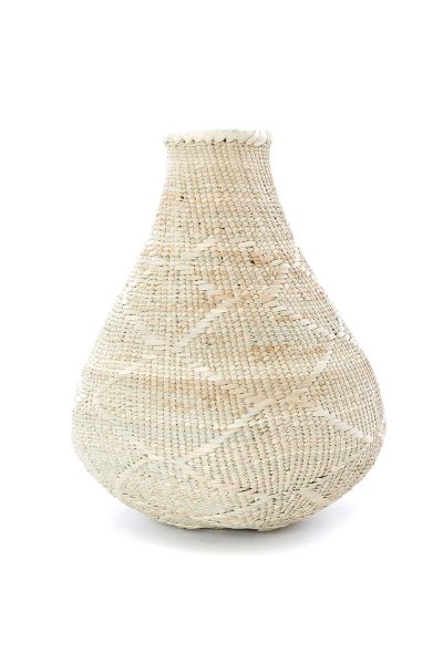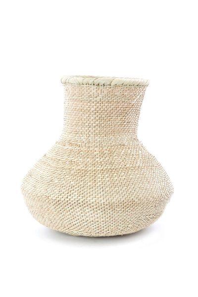 In the Binga District of northern Zimbabwe, skilled BaTonga women craft these iconic baskets from locally harvested palm leaves and wild twigs. Shaped like calabash gourds, each basket has a one-of-a-kind shape. The BaTonga people once farmed fertile land that was flooded by the damming of Lake Karibu, so weavers displaced across the lake demonstrate similar yet clearly distinctive styles.