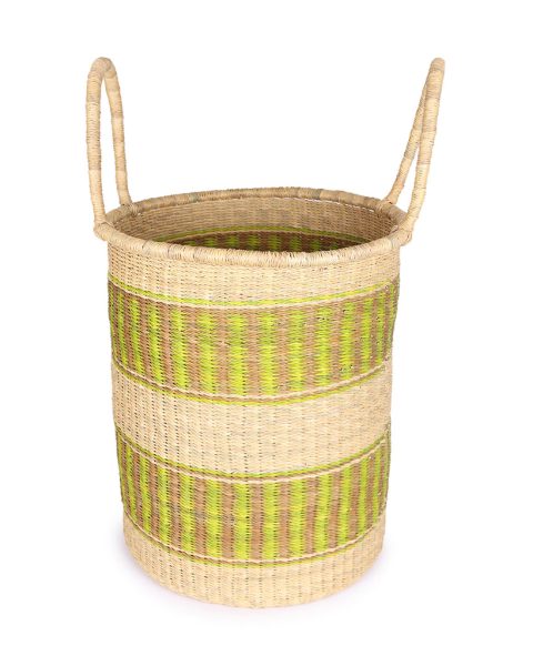 Bring deep Ghanaian colour to your fireplace with the?c?log basket, in a handy medium size. With tribal-inspired bands of?green and brown,?this tall woven basket is perfect for filling with firewood but also works as a beautiful laundry basket, toy basket, or a storage basket for bedding, towels, rugs and blankets. Every log basket in this new collection is totally unique ? made once and sold once.