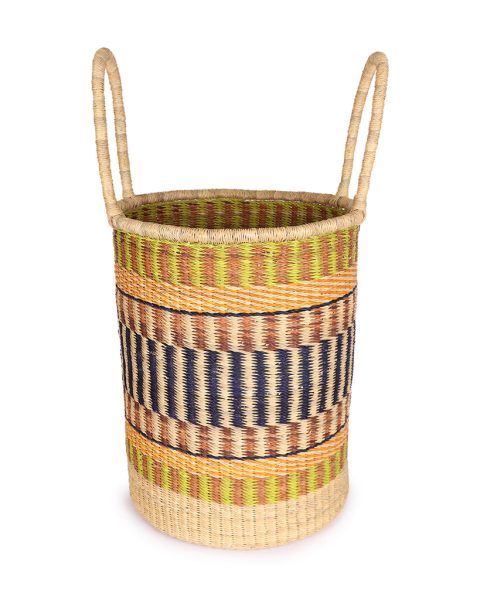 Bring deep Ghanaian colour to your fireplace with the?Nkronua?log basket, in a handy medium size. With tribal-inspired bands of?green, orange and brown, this tall woven basket is perfect for filling with firewood but also works as a beautiful laundry basket, toy basket, or a storage basket for bedding, towels, rugs and blankets. Every log basket in this new collection is totally unique ? made once and sold once.