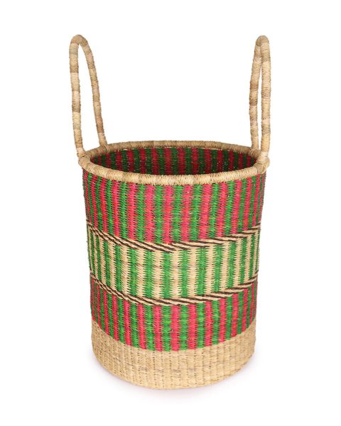 Bring deep Ghanaian colour to your fireplace with the?Nineti log basket, in a handy medium size. With tribal-inspired bands of?green and red, this tall woven basket is perfect for filling with firewood but also works as a beautiful laundry basket, toy basket, or a storage basket for bedding, towels, rugs and blankets. Every log basket in this new collection is totally unique ? made once and sold once.