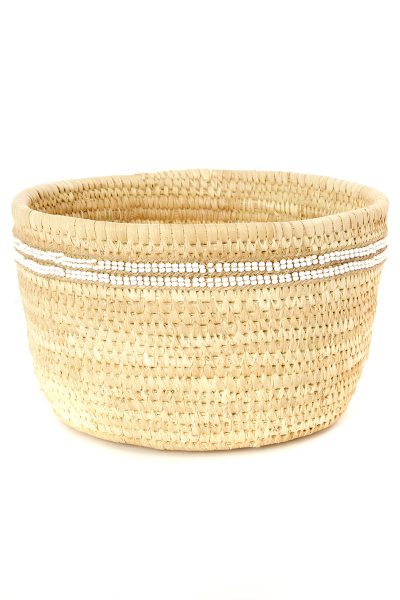 Nomadic baskets are sold in three useful nesting sizes and are adorned with plain white beads. Because these baskets are handcrafted, sizes and shapes may vary.