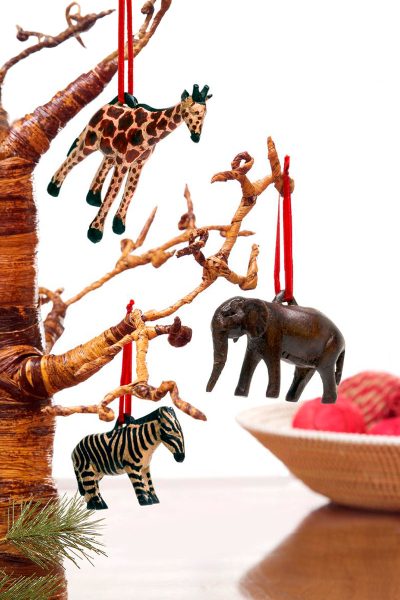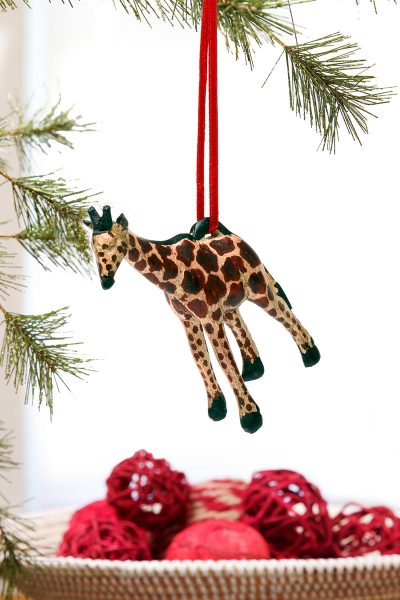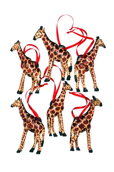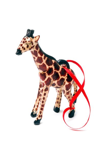 Sold by the dozen, these beautiful hand carved giraffe ornaments are a classic addition to holiday decor. With a bright red ribbon and a hand painted spotted finish, each giraffe ornament is handmade to be beautifully one of a kind.