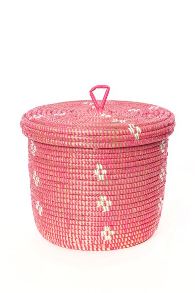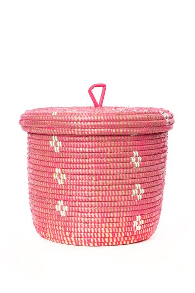 Wolof women in Senegal weave this sweet storage container by binding cattail stalks with strips of plastic recycled from prayer mats or purchased new at the mat factory in Dakar.