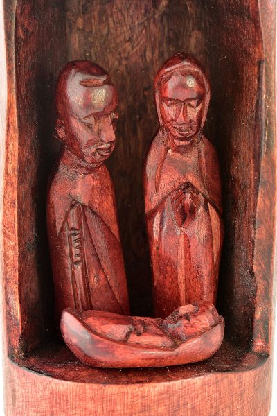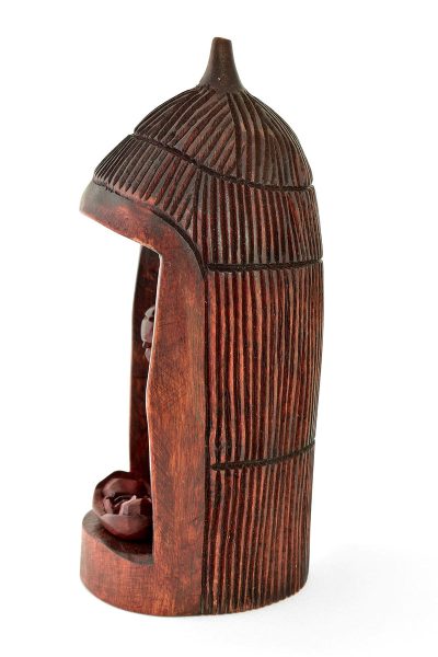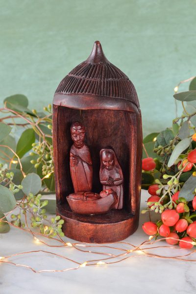 Rwandan artisans hand carve these unique nativity scenes from jacaranda wood, then add a rich brown stain. Mary, Joseph and Jesus?sit within a cozy cove, incised around to look like a little thatched hut.