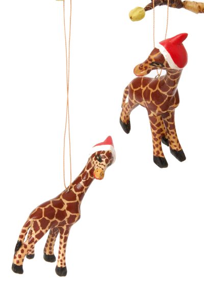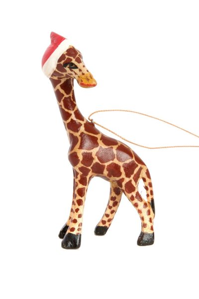 How cute! Wearing a bright little Santa hat, this hand carved jacaranda giraffe makes an adorable addition to the holiday tree. Each giraffe ornament is handmade to be beautifully one-of-a-kind.
