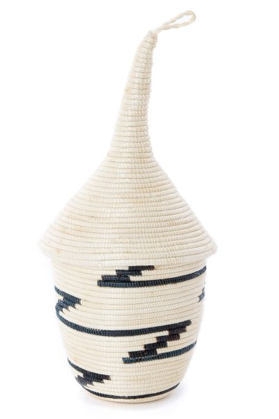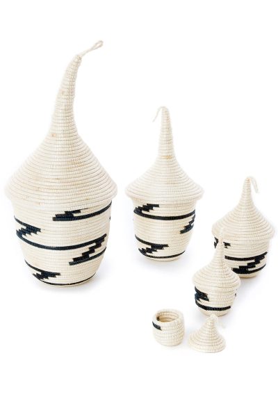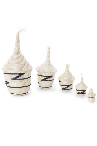 Talented Rwandan basket weavers meticulously transform fine strands of sisal into a beautiful baskets, traditionally used to bestow gifts. This sweet set features five baskets of descending size, all nested together. Assorted designs are incorporated using strands dyed to a shade of black or dark blue. Please note that the coloration of the white sisal can vary to include brown areas.
