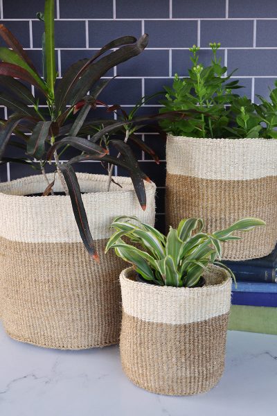 This versatile set of nesting baskets is handwoven by talented rural Kenyan women using strands of natural and hand-dyed sisal. The baskets are coveted for their ability to be re-shaped, as well as their durability and all-natural composition.