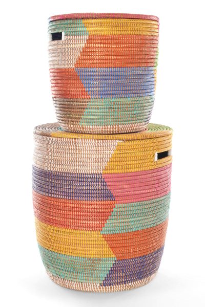 This fun and functional set of handcrafted baskets features two nesting sizes in a rainbow herringbone pattern. Each basket is carefully handmade by a talented Wolof woman in rural Senegal, and features cut-out handles and a flat lid.
