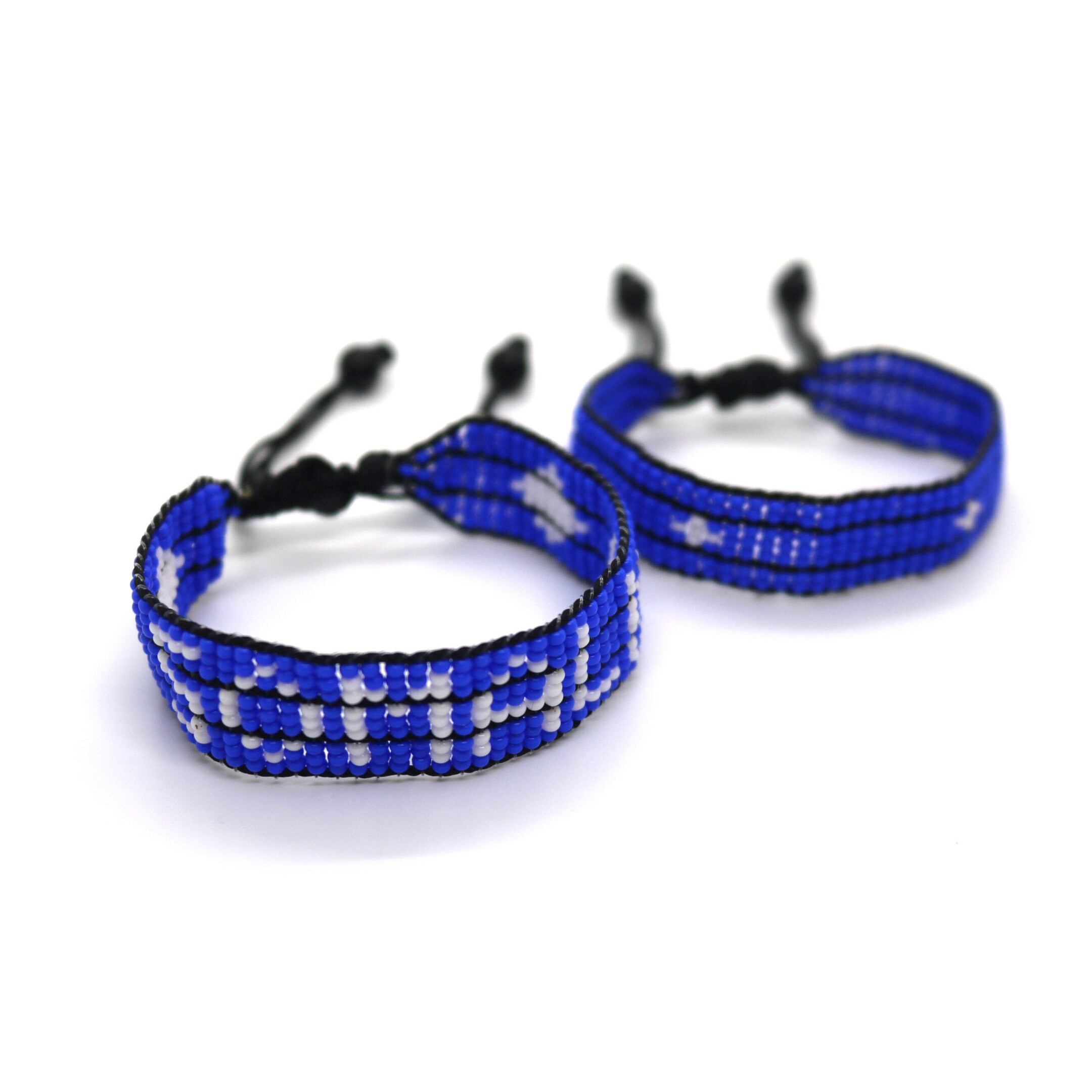 This adjustable flag bracelet is made with shanga beads that are intricately hand woven to produce a design resembling the flag colors and pattern. This bracelet is adjustable to fit most wrist sizes. To adjust the bracelet, pull the thread by spherical black beads in opposite directions.