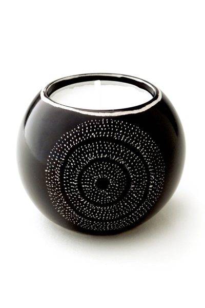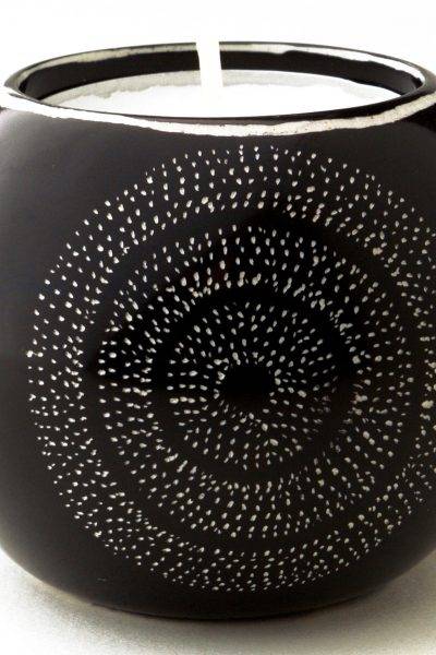 Kenyan artisans handcraft this beautifully serene tea light candleholder by carving soft soapstone and applying a deep dyed black finish. Radiating rings of etched stars add a subtle visual contrast.