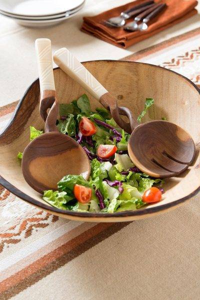 A beautiful set of salad servers with a twist. Handcrafted from wild olive wood and accented with bone, these stylish servers will bring a bit of cultural interest to mealtime.