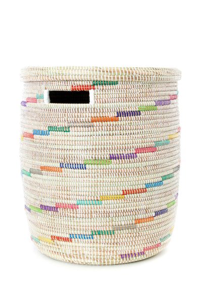 Wolof women in the West African nation of Senegal update traditional coil weaving methods by enlivening natural grass baskets with colorful strips of plastic salvaged from a mat factory. Cattails grow abundantly in rural Senegal, so women can earn a sustainable income from basket weaving while enriching homes around the world with modern African craftsmanship.