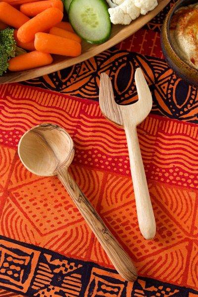 Kenyan carvers transform beautifully grained wild olive wood to create this uniquely styled set of salad servers. The spoon features a lovely rounded bowl, and the fork’s head is carved in the shape of a bident.