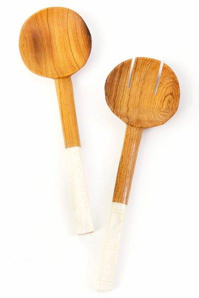 Wild Olive Wood Salad Servers with White Bone Handles